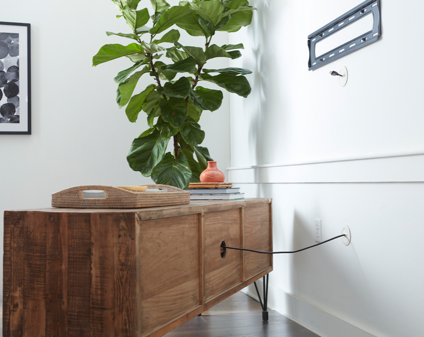 In-wall cable management solutions make cords completely disappear. However, they require a bit more work than on-wall options. Yes, you will need to cut holes in your wall, but this isn’t as scary as it sounds. If you have a few basic tools and 30 minutes, hiding your TV cables can be done by any DIYer.