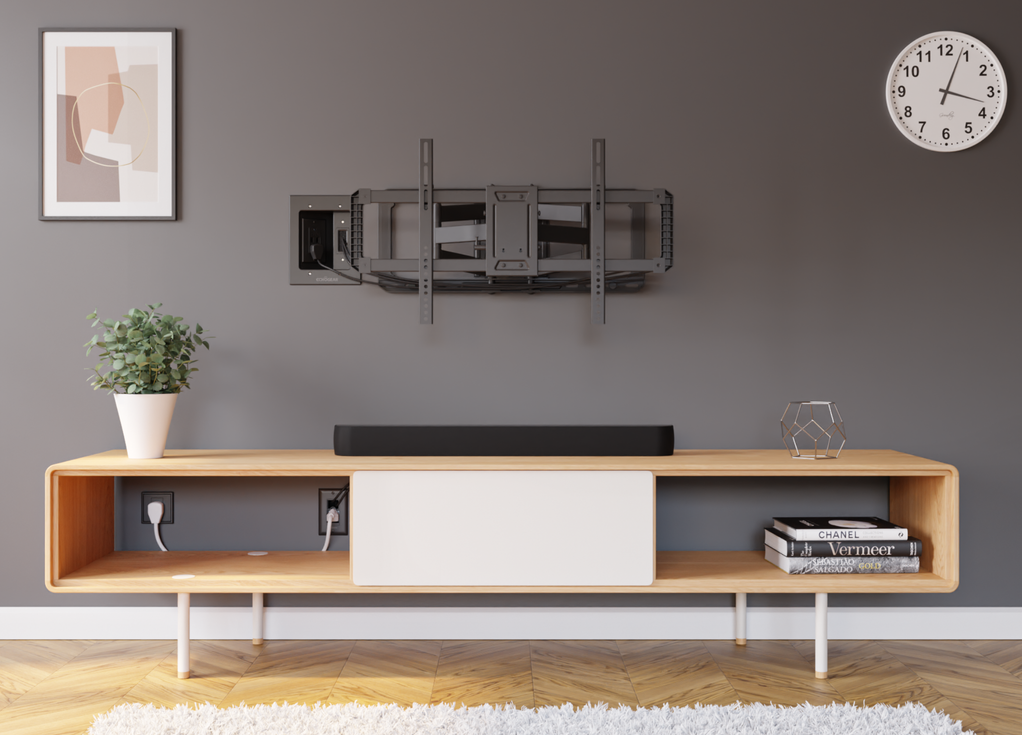 Have a soundbar mounted to the wall under your TV and don’t know what to do with that wire? We’ve got your back. For the best way to hide your TV and soundbar wires behind the wall, check out this piece of work. It has the same circular modules at the top and bottom as before, but also includes a slim rectangular port that can power & hide your soundbar cables.